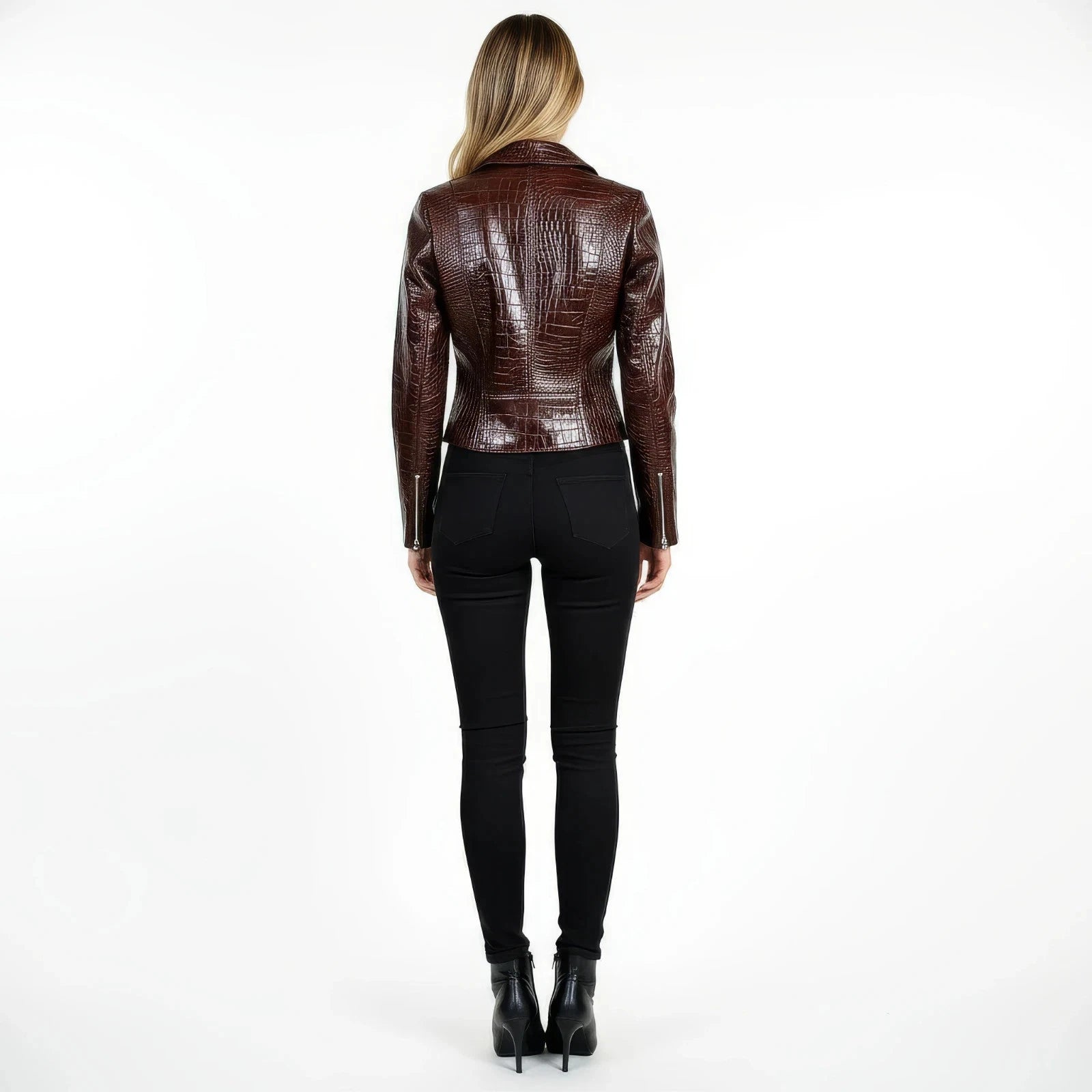 Women’s Brown Crocodile Embossed Faux Leather Biker Jacket